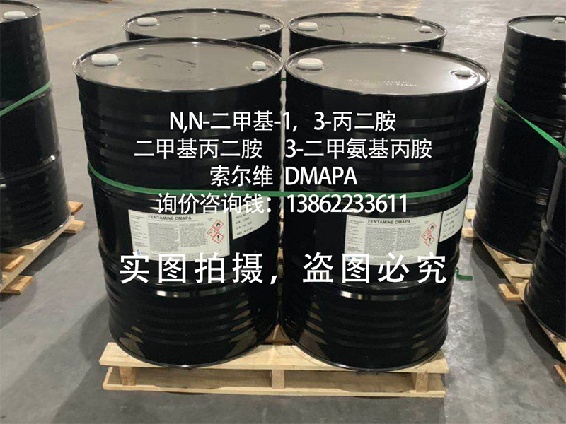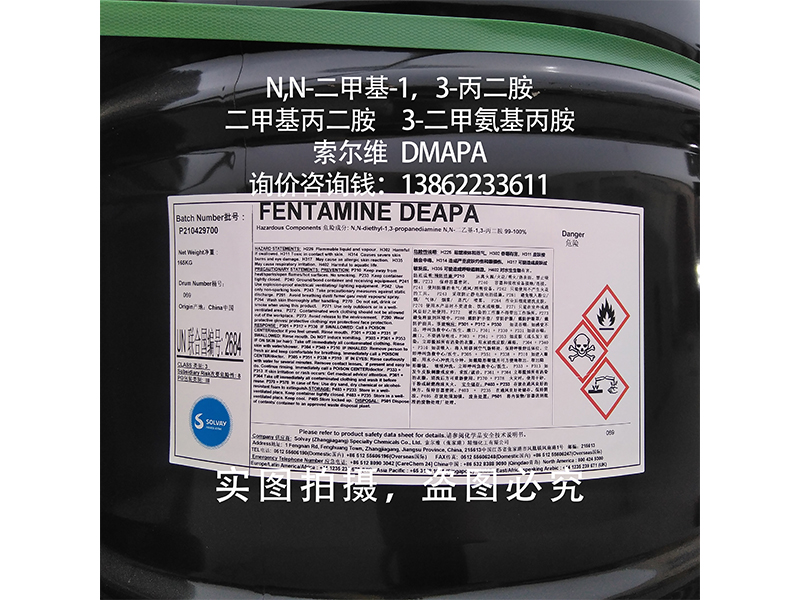 安全防护 | N,N-二甲基-1,3-丙二胺(二甲基丙二胺,3-二甲氨基丙胺,DMAPA)为化工合成中间体原料,使用过程中请避免与眼睛及皮肤接触,若有接触,请及时用大量清水冲洗并送医诊治; |