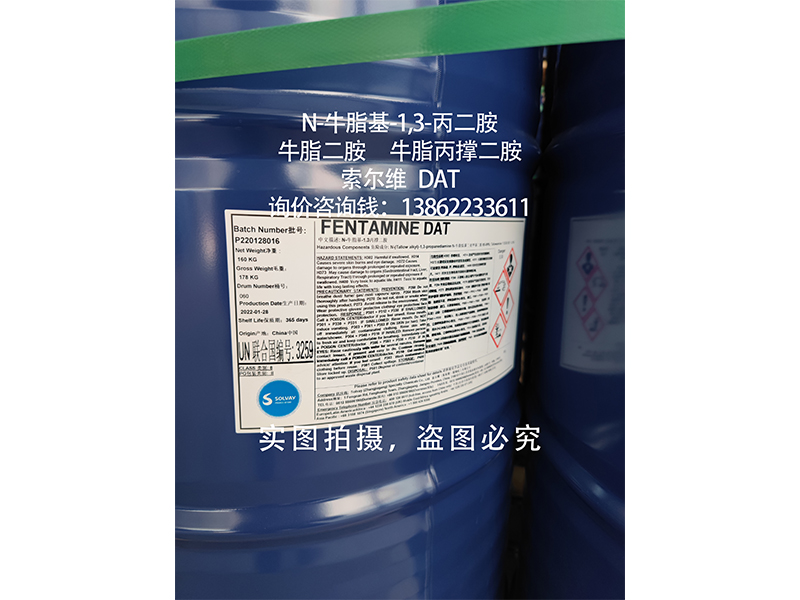 安全防护 | N-牛脂基-1,3-丙二胺(牛脂基丙撑二胺,DAT)为化工合成中间体原料,使用过程中请避免与眼睛及皮肤接触,若有接触,请及时用大量清水冲洗并送医诊治; |