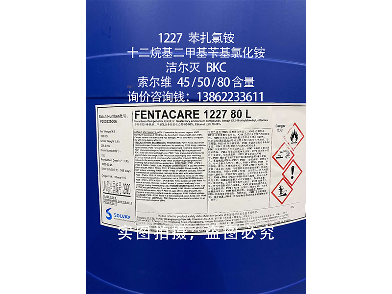 安全防护 | 1227(苯扎氯铵,十二烷基二甲基苄基氯化铵,洁尔灭)为化工合成中间体原料,使用过程中请避免与眼睛及皮肤接触,若有接触,请及时用大量清水冲洗并送医诊治; |