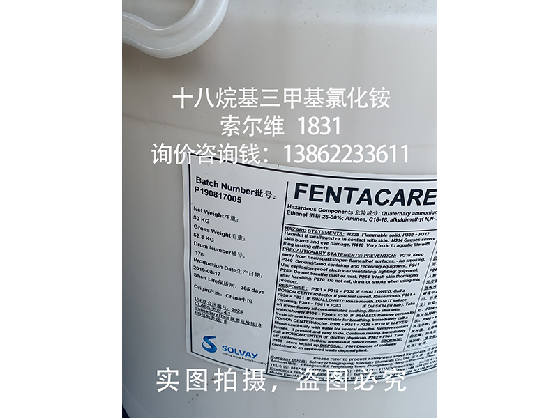 包装 | 十八烷基三甲基氯化铵(1831)为50,170公斤/桶包装;贮于室内阴凉通风处,防潮、严防曝晒,贮存期十二个月。 | |
